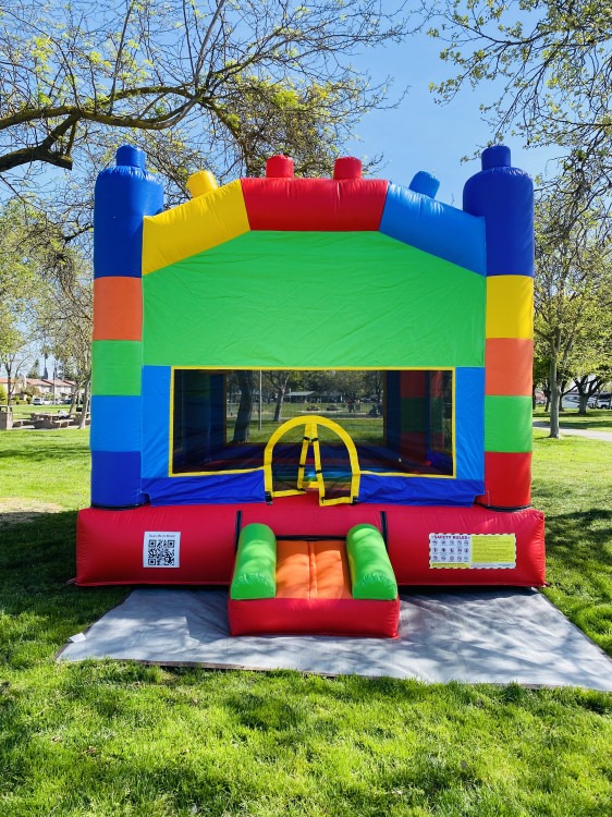 Block Party Bounce House is a bright, block-themed inflatable with a roomy jump area, mesh windows for airflow and visibility.