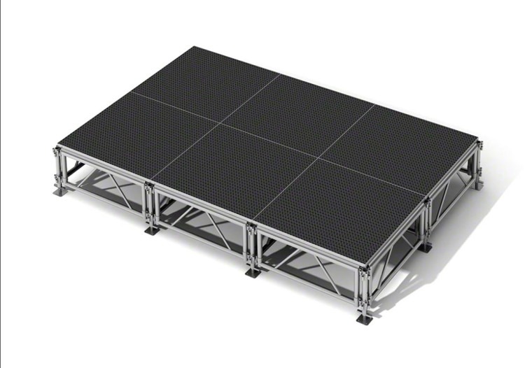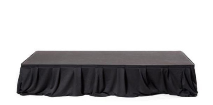An 8x12 black stage is a portable, professional-looking platform measuring eight feet by twelve feet, finished in a sleek black that blends with any event décor. Designed for easy setup and versatile use, it provides a stable, elevated surface perfect for performances, speeches, DJs, awards, fashion shows, or as a focal point for ceremonies. The compact footprint makes it well-suited for indoor and outdoor venues with limited space, while the dark finish minimizes visual distractions and highlights people or equipment on top. Ideal for rentals, this stage offers reliable support and a polished appearance to help any gathering feel more organized and theatrical.
