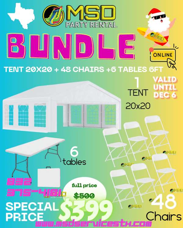 This bundle includes a 20x20-foot canopy and 48 folding chairs — an ideal all-in-one solution for outdoor events, parties, or gatherings where both shade and seating are needed. The 20x20 canopy provides a generous covered area to protect guests from sun or light rain while defining a central space for dining, presentations, or activities. The 48 folding chairs offer comfortable, portable seating that’s easy to arrange in rows, around tables, or in social clusters. Together, the canopy and chairs simplify setup and coordination, making this bundle perfect for family reunions, small ceremonies, vendor booths, school events, or backyard celebrations that require reliable shelter and ample seating.