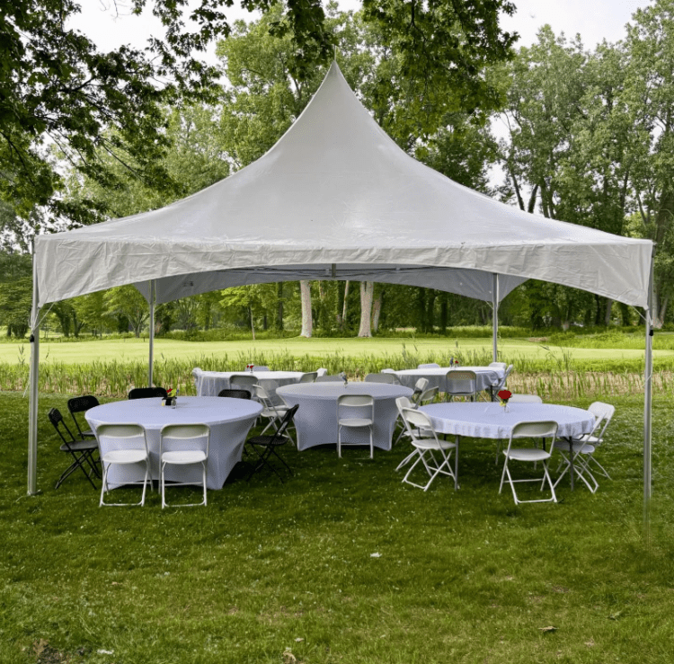 Tent: 20ft x 20ft high-peak frame tent — provides shade, weather protection, and a beautiful focal point for your event