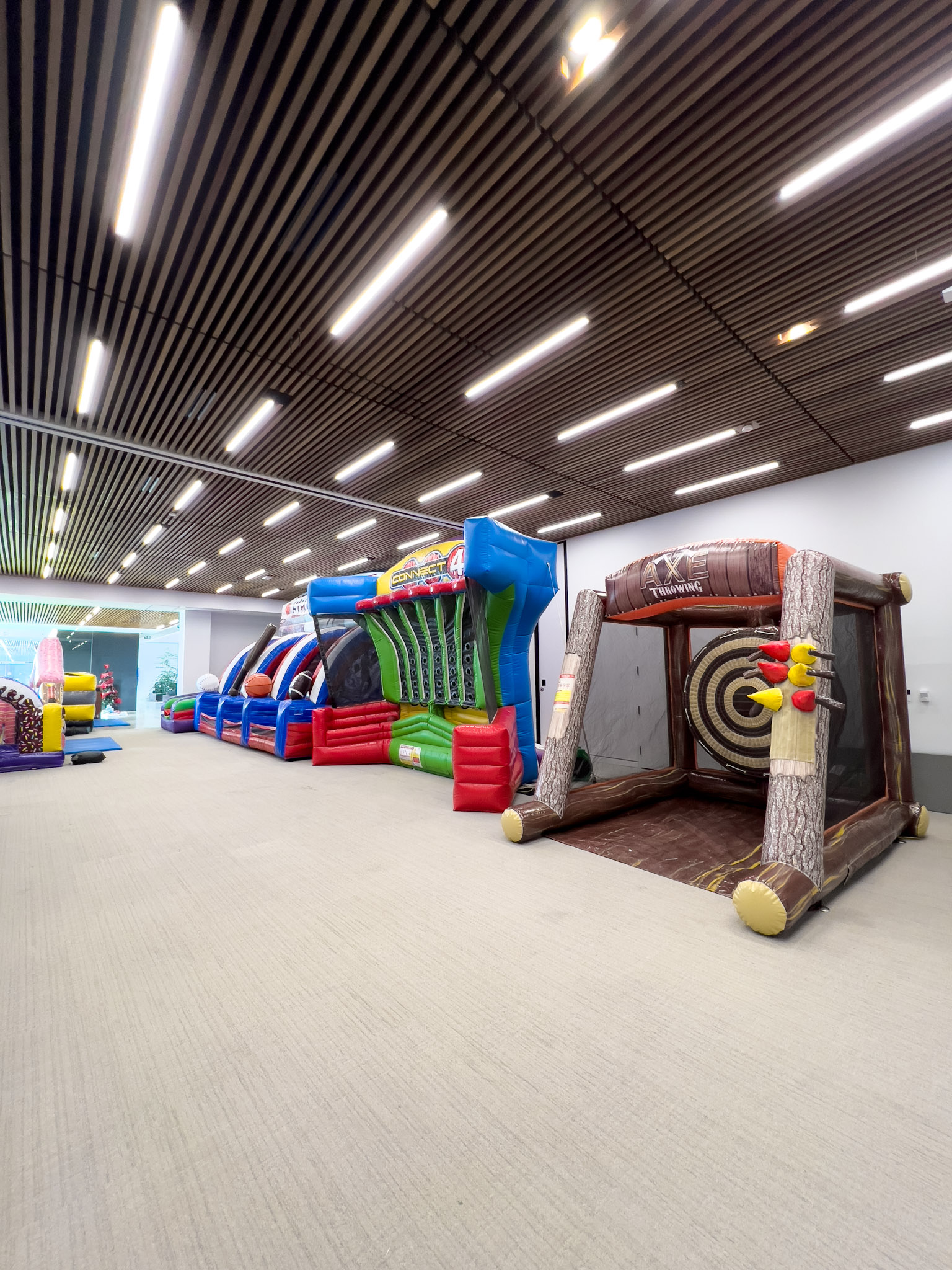 On each of our product pages, you’ll see the exact measurements of the rental. When planning your event, we recommend leaving an extra foot or two around and above the inflatable. This extra space makes it easier for our team to set up and ensures the inflatable/event rental doesn’t touch things like walls, light fixtures, wires, or trees.