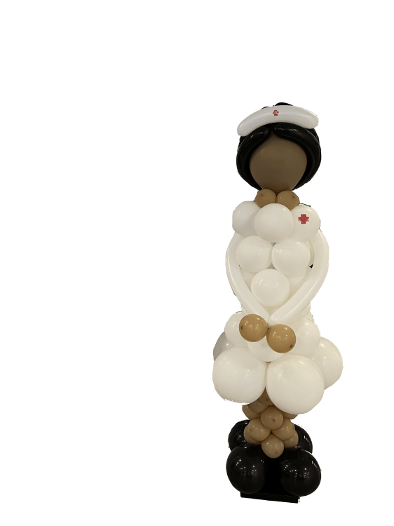 A life-sized balloon sculpture designed to honor and celebrate nurses, perfect for medical-themed events, healthcare appreciation days, or special occasions. This 7-foot-tall nurse display features a detailed and professional design, complete with a uniform, stethoscope, and other nursing accessories.