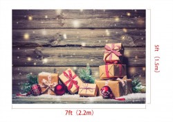Photography backdrop with brown wood wall and presents, snow and glitter. Ideal for Holiday photos. Backdrop stand not included please choose an option to use unless you own one of your own.