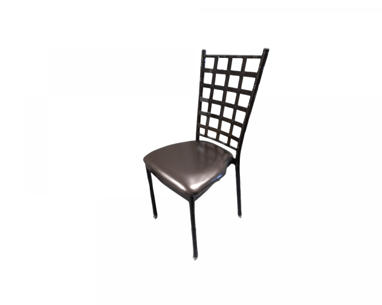 This French Chiavari Chair is a unique find in a beautiful brushed, rich, dark chocolate with lattice style back and has an attached same color seat on a metal frame. This elegant chair is a departure from the traditional Chivari chair and is an excellent seating option for a lunch, gala, or wedding event.