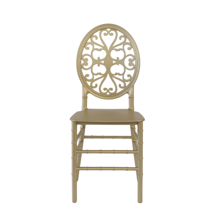 Gold elaborate scroll back chair with intricate design. Unique and beautiful. Great for a garden party or wedding.