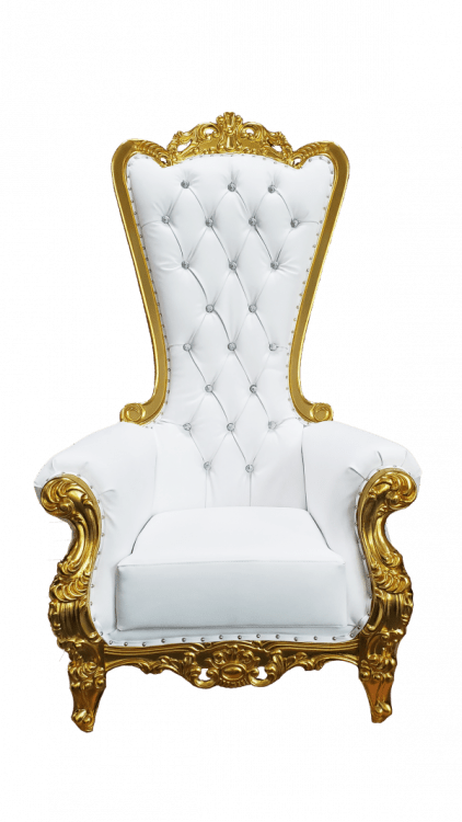 Padded Throne Chair White with gold trim great for photos, Baby showers, prom send off's and for bride and groom chairs. Makes for and excellent king and queen chair set or a winter wonderland event.